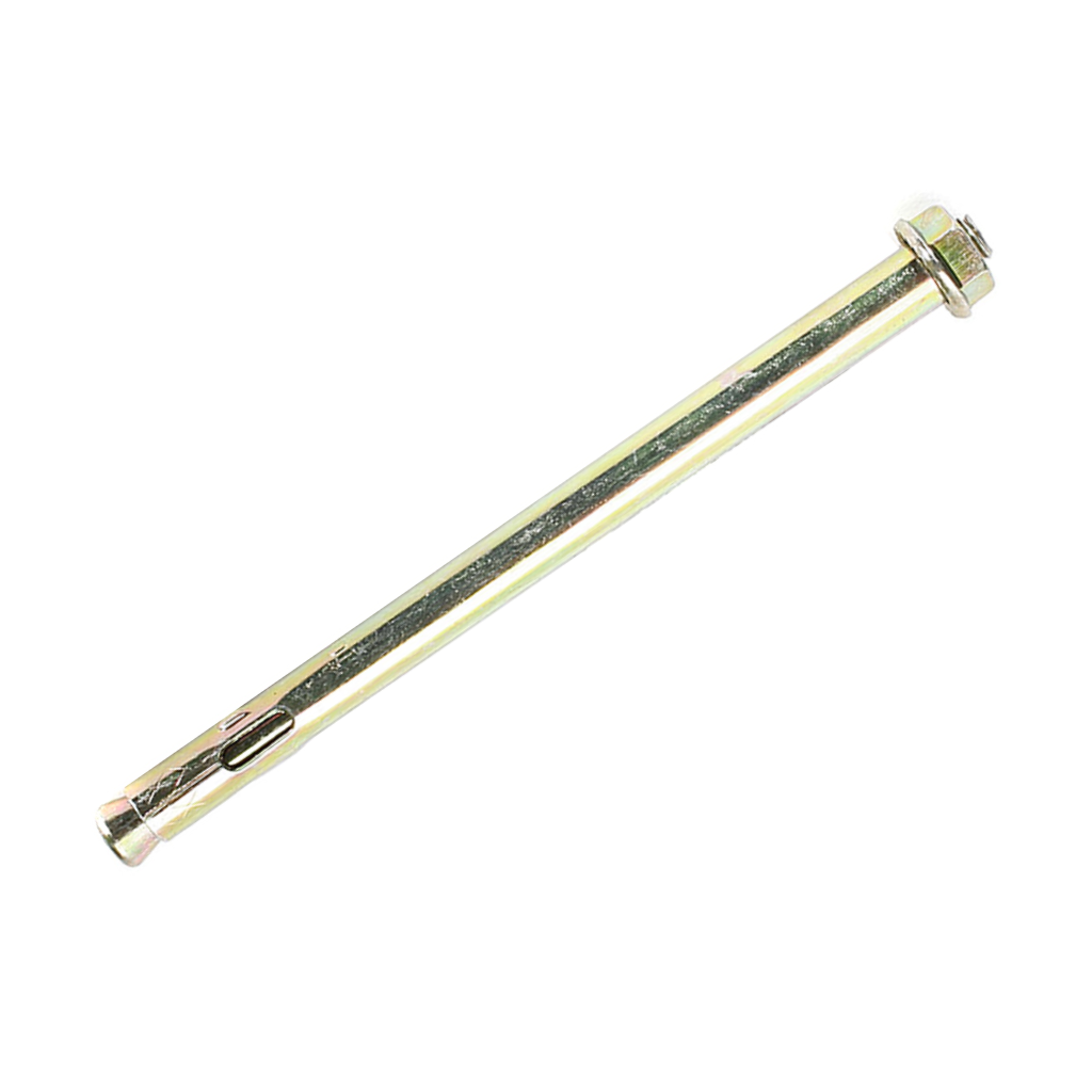 Анкерный болт с гайкой работает по принципу распора: при закручивании гайки шпилька с распором перемещается в сторону гайки, расклинивая внешнюю оболочку, которая упирается в стенки отверстия.