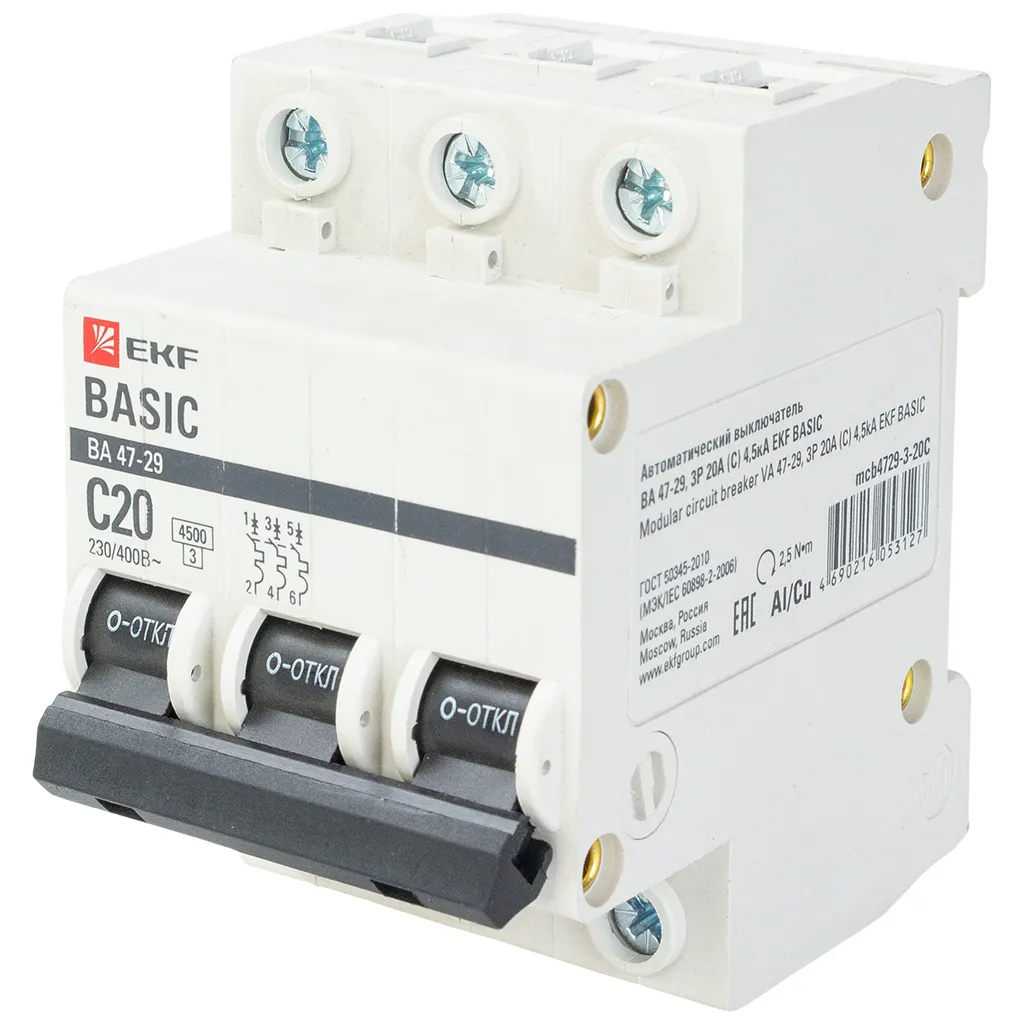 Выключатель автоматический ВА47-29 EKF, 3 полюсный, 20А С 4.5кА