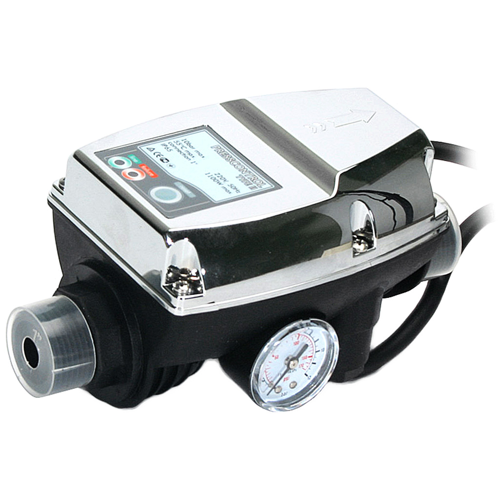 Электронное реле «Прессконтроль тип II» обеспечивает постоянный напор воды, устанавливается на напорный трубопровод и подключается к насосу. Устройство имеет обратный клапан и защиту от «сухого хода». Реле оснащена индикатором рабочего состояния и неисправности, включение/выключение насоса по давлению в системе. К примеру, при начале водозабора (открытии крана) и падении давления ниже 1.5 бар он его будет автоматически включать, а через 10-15 секунд после конца водозабора (закрытии крана) отключать.