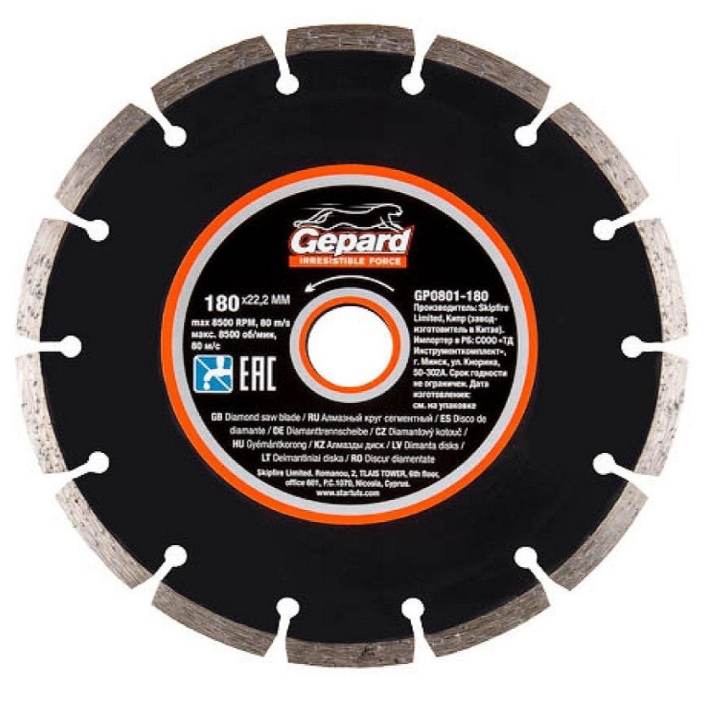 Диск отрезной Gepard, алмазный, 180х22.2мм, универсальный, сегментный, мокрый и сухой рез