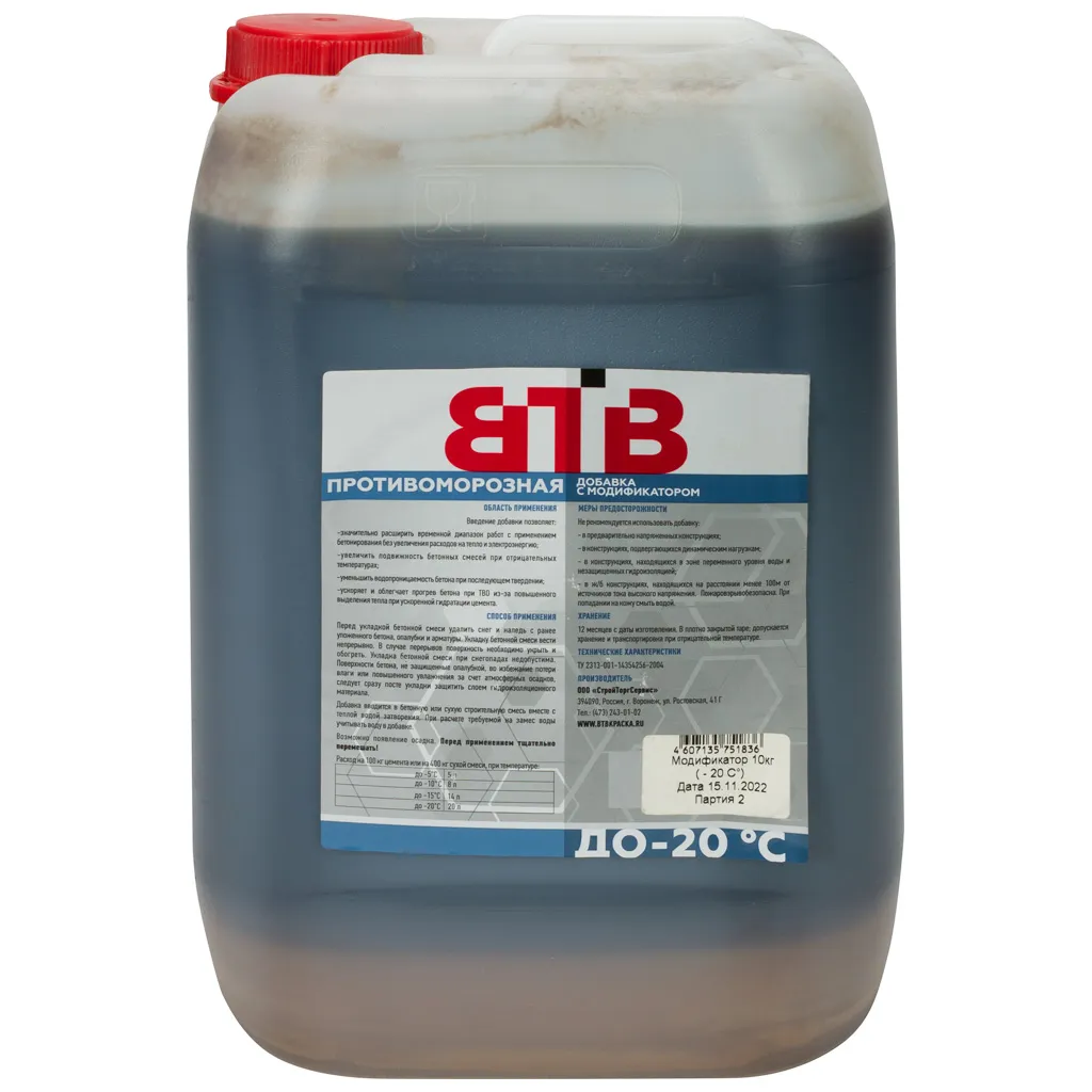 Модификатор противоморозный ВТВ, противоморозного действия положительно влияет на сроки схватывания бетона, кинетику сохраняемости бетонной смеси, что в значительной степени формирует структуру и важнейшие физико-химические свойства бетонов, в том числе увеличивает их долговечность. Снижает точку замерзания воды затворения для бетонов и цементных растворов.