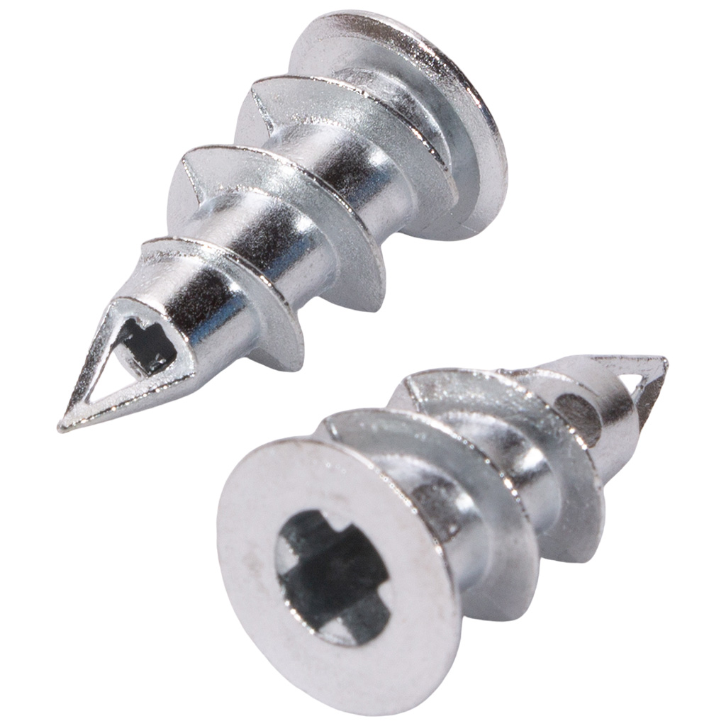 Дюбель вкручивается непосредственно в гипсокартон, после чего в его центральное отверстие вставляется саморез. Крупная резьба предотвращает прокручивание, а площадь контакта обеспечивает надёжную фиксацию.