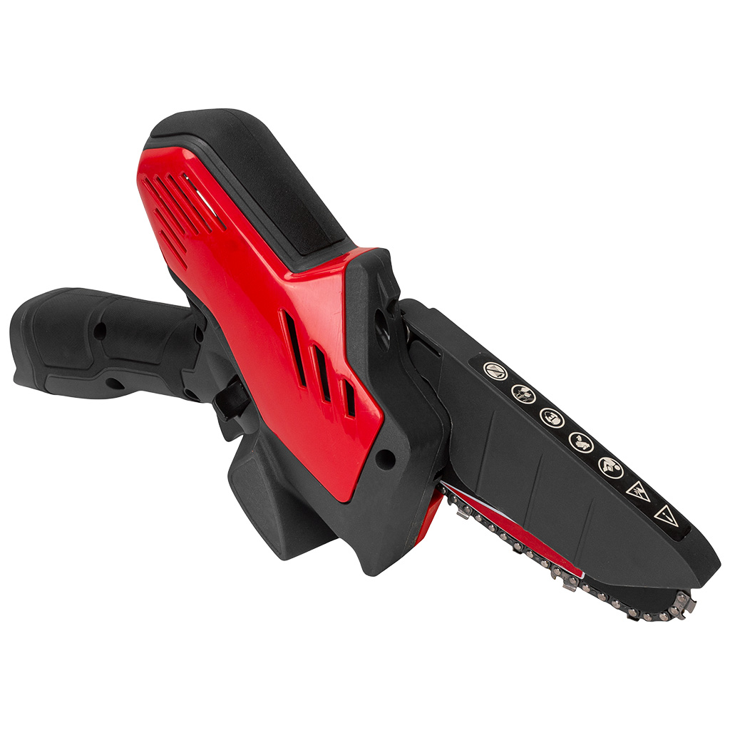 Система быстрого натяжения позволит отрегулировать цепь без дополнительных инструментов. На одном аккумуляторе при минимальных нагрузках мини цепная пила сможет работать до 25 минут. Очень легкая электропила аккумуляторная садовая, благодаря эргономичной прорезиненной ручке, комфортно ляжет в руку.