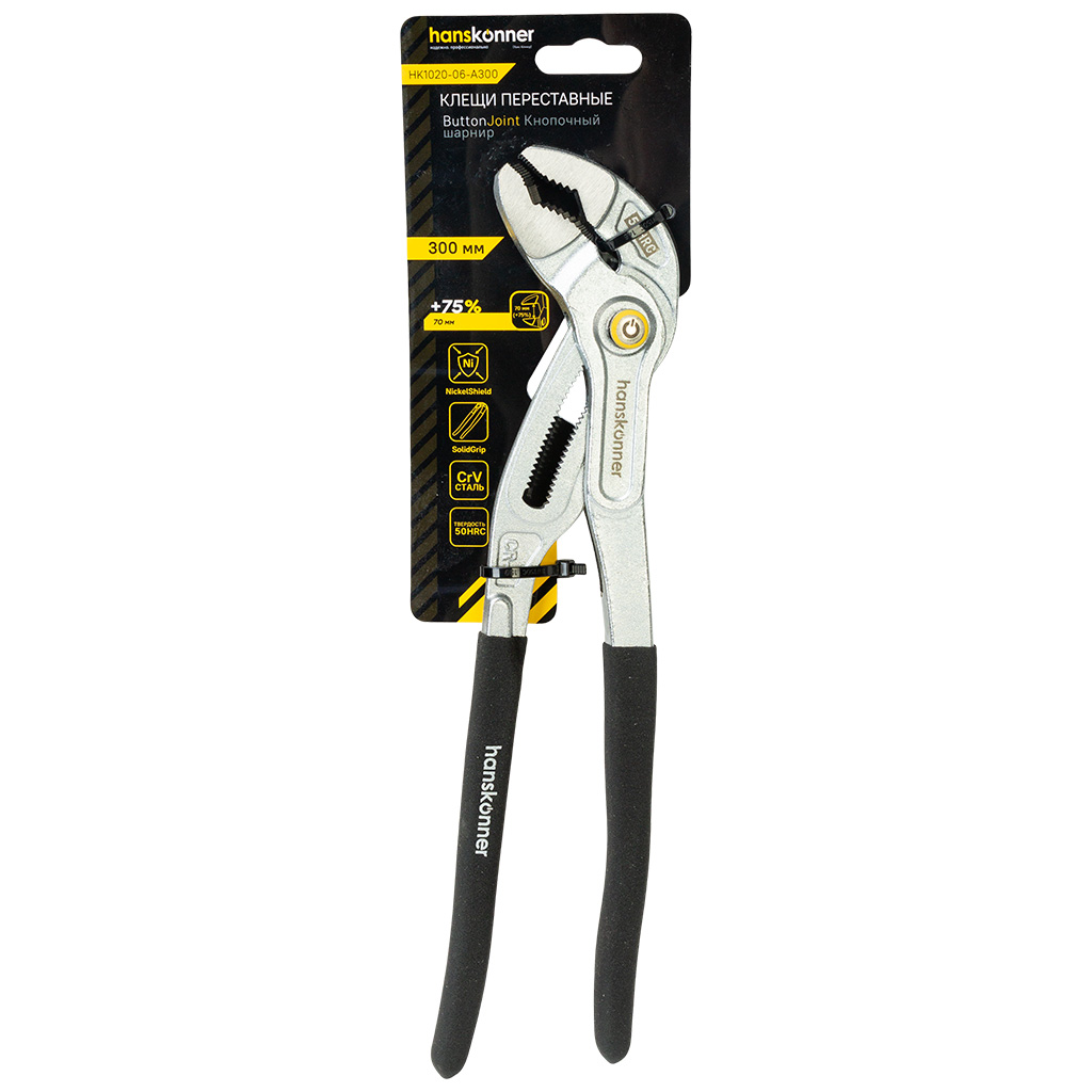 Клещи переставные Hanskonner, кнопочный шарнир, зев 70мм, 300мм