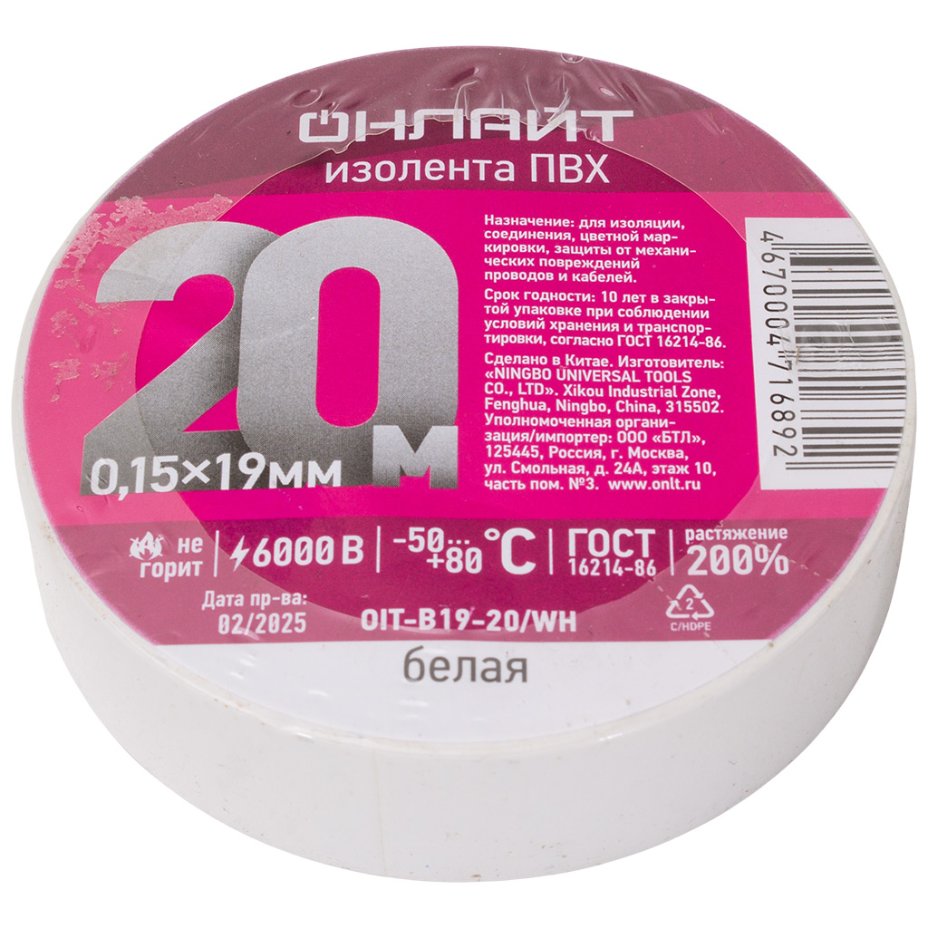 Изолента ПВХ Онлайт, 19ммх20м, белая