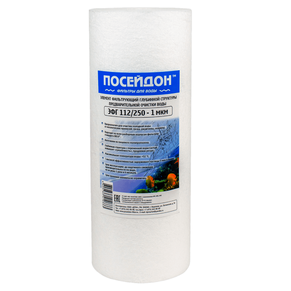 Картридж Посейдон ЭФГ 112/250-10ББ, предназначен для очистки холодной воды от механических примесей: песка, ржавчины, окалины. Картридж идеально подходит для установки в корпуса фильтров стандарта Big Blue 10" (BB10). Изготовлен из пищевого полипропилена. Глубинная структура с переменной пористостью повышает грязеёмкость, продлевая ресурс. Максимальная температура воды: +52 C.