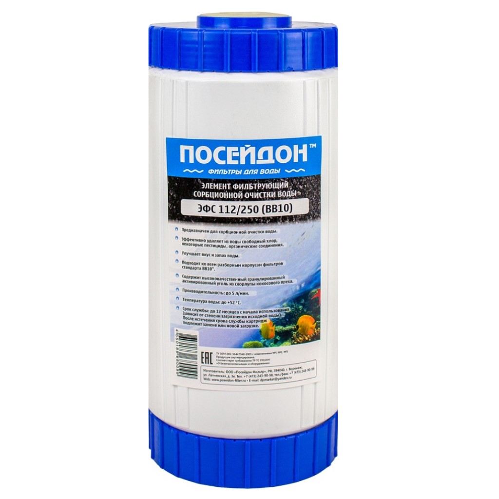 Картридж Посейдон ЭФС 112/250М-10ББ, предназначен для сорбционной очистки воды. Содержит высококачественный гранулированный активированный уголь из скорлупы кокосового ореха. Картридж легко удаляет все неприятные запахи и корректирует вкус. Кроме этого, сорбционные свойства активированного угля позволяют очистить воду от хлористых соединений, органики, пестицидов, инсектицидов, химических соединений и нерастворимых загрязнителей. Активированный уголь получают из обжигания древесины и обработки её под высокой температурой без подачи кислорода. Картридж подходит ко всем разборным корпусам фильтров стандарта Big Blue 10" (BB10) для любых брендов.