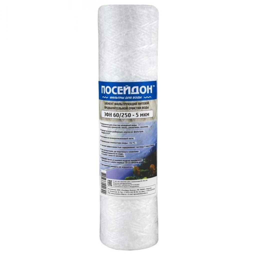 Картридж Посейдон ЭФН 60/250-50мкм, изготовлен из полипропиленовой нити, намотанной на жёсткий полиэтиленовый каркас. Намотка обеспечивает большую грязеёмкость по сравнению с картриджами из вспененного полипропилена. Картридж используется в магистральных фильтрах и предфильтрах многоступенчатых систем очистки воды. Предназначен для очистки воды от механических примесей: песка, ржавчины, ила и т.д. Защищает стиральные, посудомоечные машины, водонагреватели от неблагоприятного действия механических примесей.