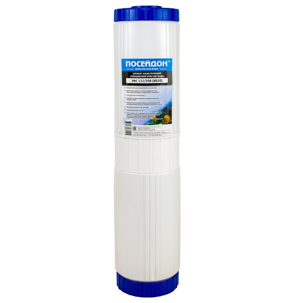 Картридж Посейдон ЭФС 112/508М-20ББ, предназначен для сорбционной очистки воды. Содержит высококачественный гранулированный активированный уголь из скорлупы кокосового ореха. Картридж легко удаляет все неприятные запахи и корректирует вкус. Кроме этого, сорбционные свойства активированного угля позволяют очистить воду от хлористых соединений, органики, пестицидов, инсектицидов, химических соединений и нерастворимых загрязнителей. Активированный уголь получают из обжигания древесины и обработки её под высокой температурой без подачи кислорода. Картридж идеально подходит для установки в корпуса фильтров стандарта Big Blue 20'' (BB20).