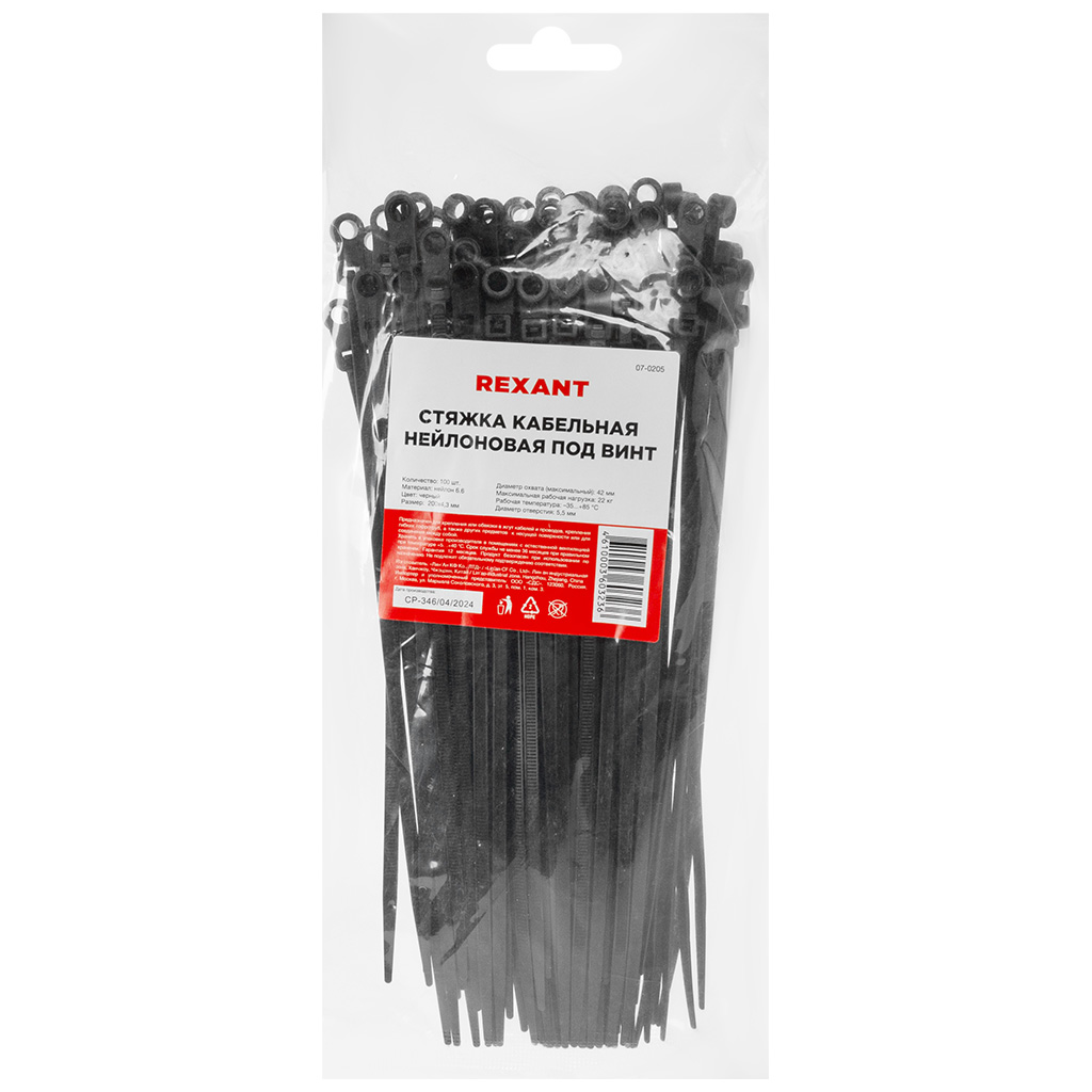 Хомут нейлоновый под винт Rexant, 4.3х200мм, черный, 100шт/уп.