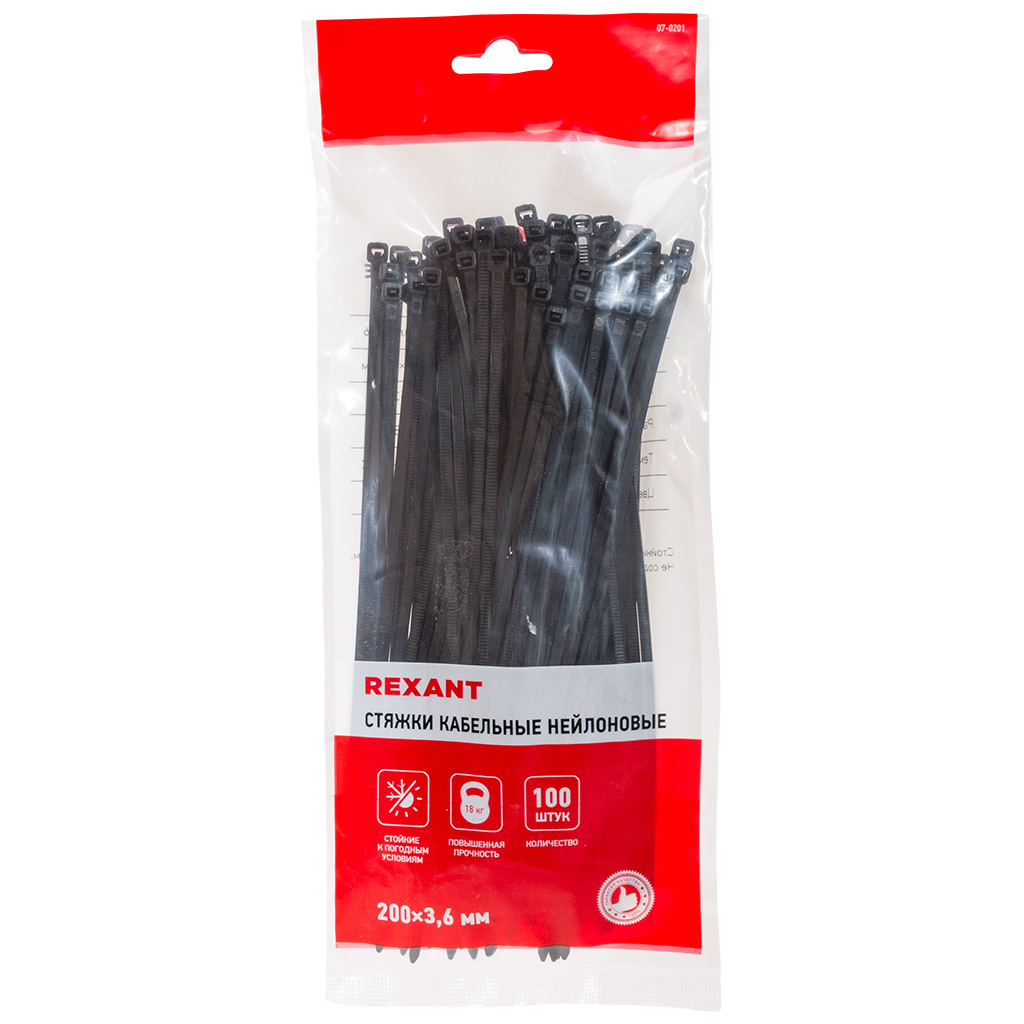 Хомут нейлоновый Rexant, 3.6х200мм, черный, 100шт/уп.