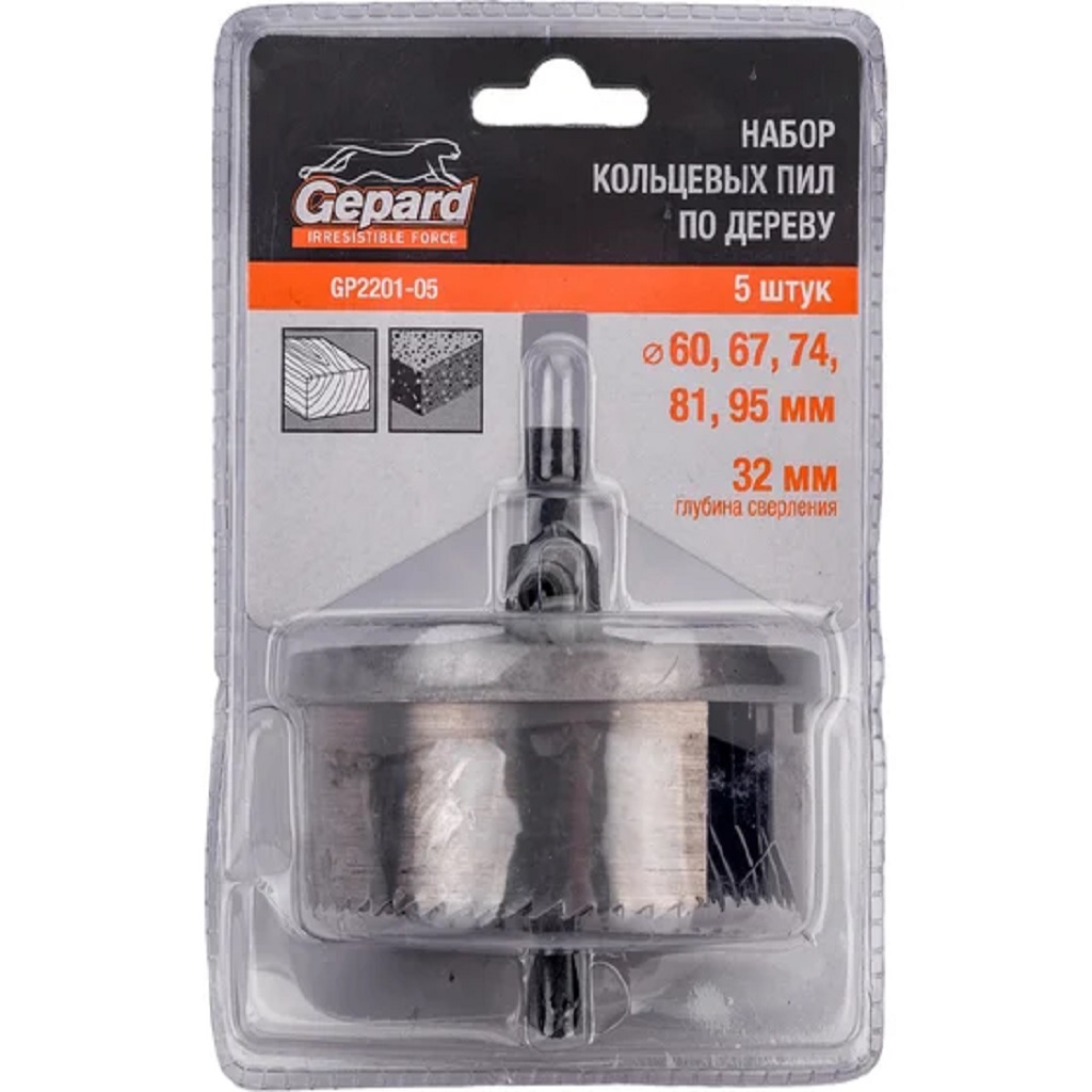 Набор коронок по дереву Gepard, 5 предметов, 60-95мм