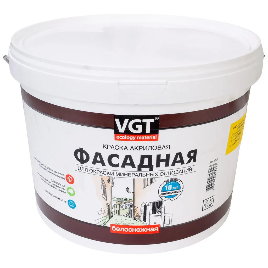 Краска акриловая VGT АК-1180, применяется для окраски фасадов и для внутренних отделочных работ.