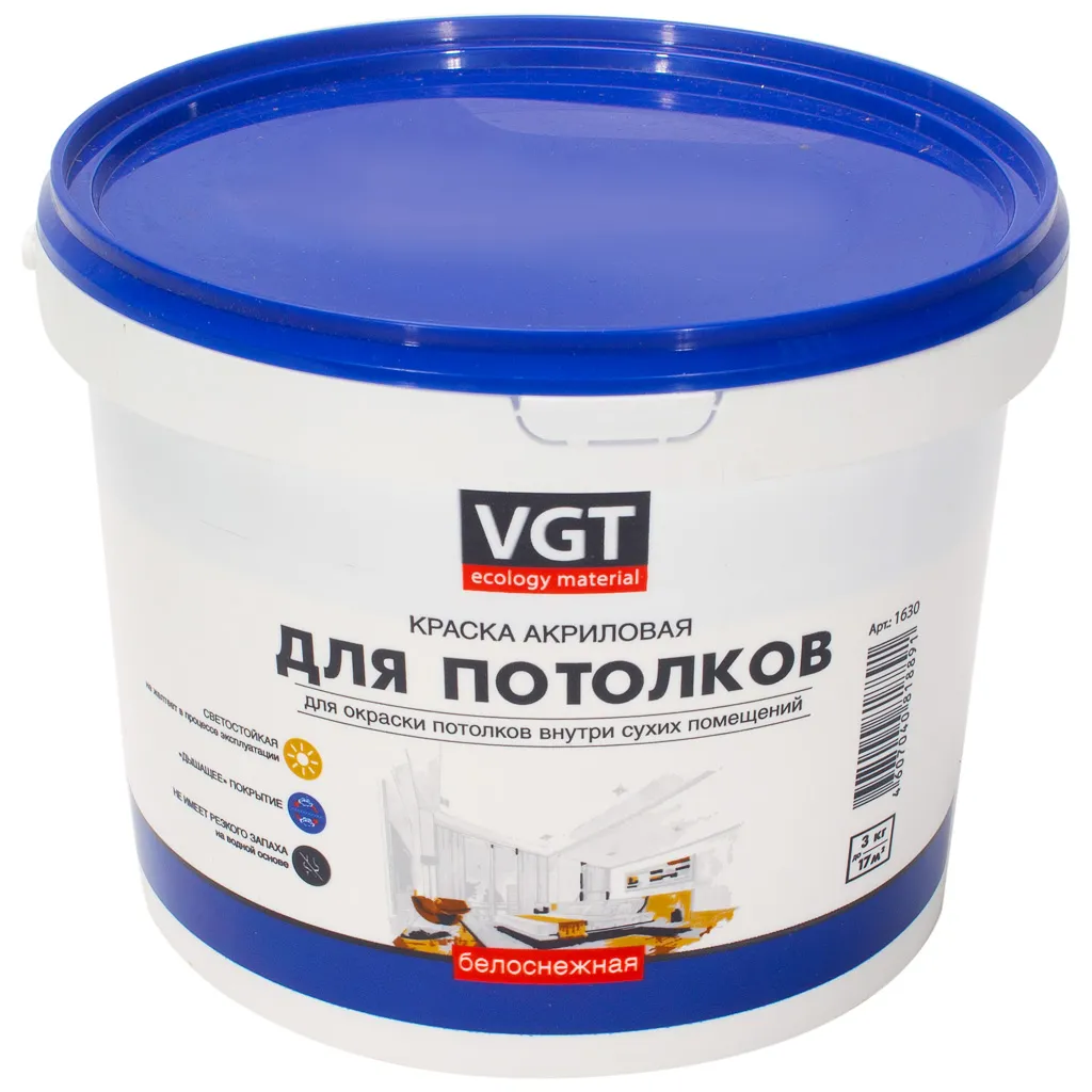 Краска акриловая VGT АК-2180, для потолков, подходит для окрашивания бетонных, кирпичных, гипсокартонных поверхностей в помещениях с нормальной влажностью.