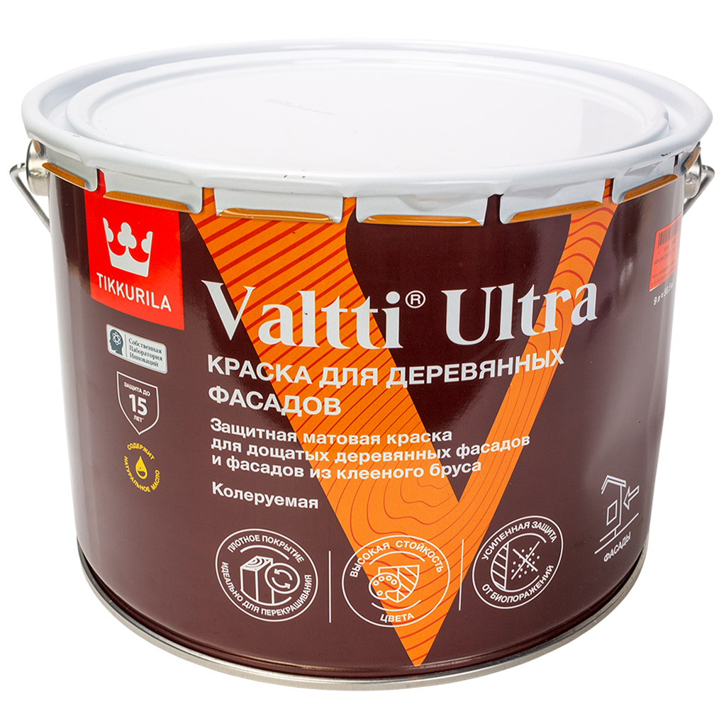 Краска водно-дисперсионная Tikkurila Valtti Ultra, применяется для окраски дощатых наружных стен (включая деревянные панели, блок-хаус, планкен, вагонку) и фасадов из клееного бруса, обшивочных досок, заборов, беседок, навесов и других подобных поверхностей.
