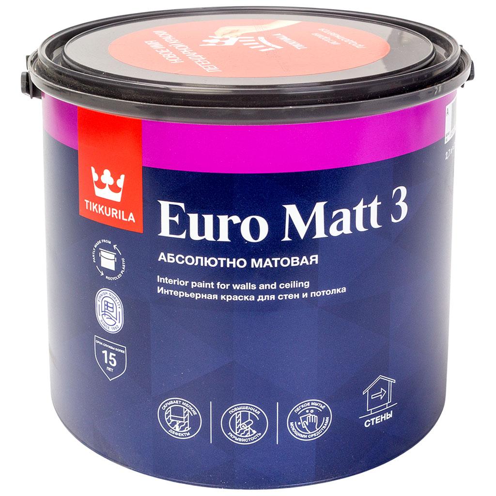 Краска водно-дисперсионная Tikkurila Euro Matt-3, предназначена для окраски стен и потолков в сухих помещениях по бетонным, кирпичным, оштукатуренным, зашпатлеванным поверхностям, гипсокартону, древесностружечным и древесноволокнистым плитам.