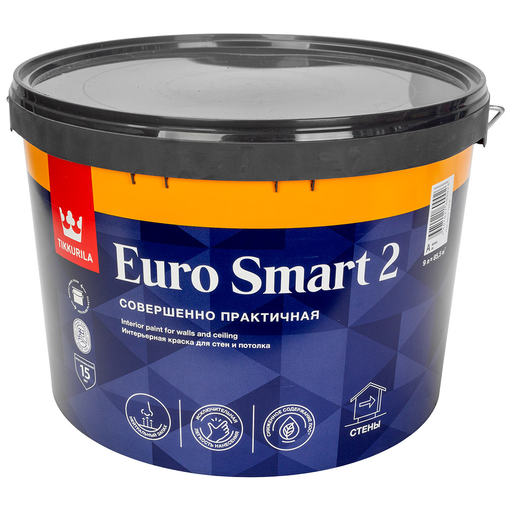 Краска водно-дисперсионная Tikkurila Euro Smart-2, предназначена для окраски стен и потолков в сухих помещениях по бетонным, кирпичным, оштукатуренным, зашпатлеванным поверхностям, гипсокартону, древе...