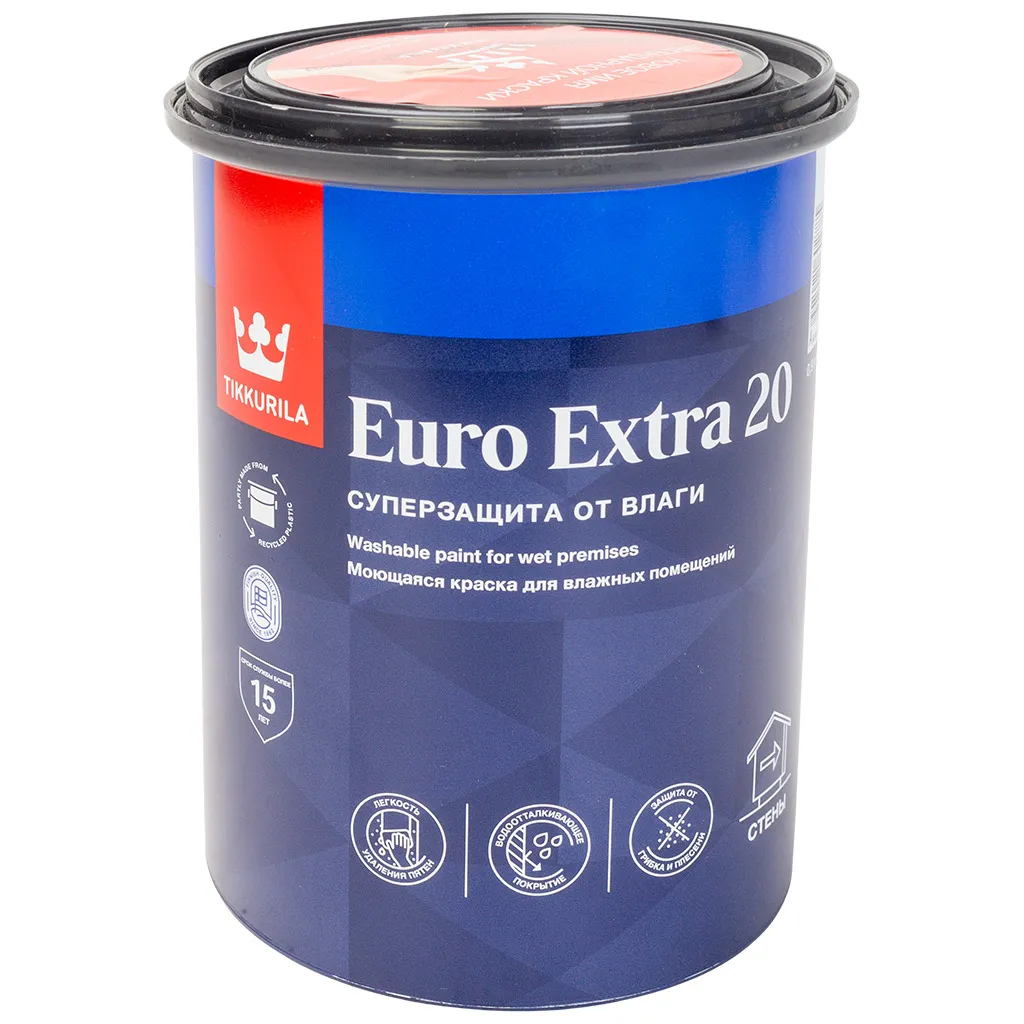 Краска водно-дисперсионная Tikkurila Euro Extra-20, предназначена для окраски стен и потолков в помещениях с умеренной и повышенной влажностью: кухня, ванная комната, санузел, прачечная и т.д. по бетонным, кирпичным, оштукатуренным, зашпатлеванным поверхностям, гипсокартону, древесностружечным и древесноволокнистым плитам, обоям под окраску, подходит для окраски радиаторов.