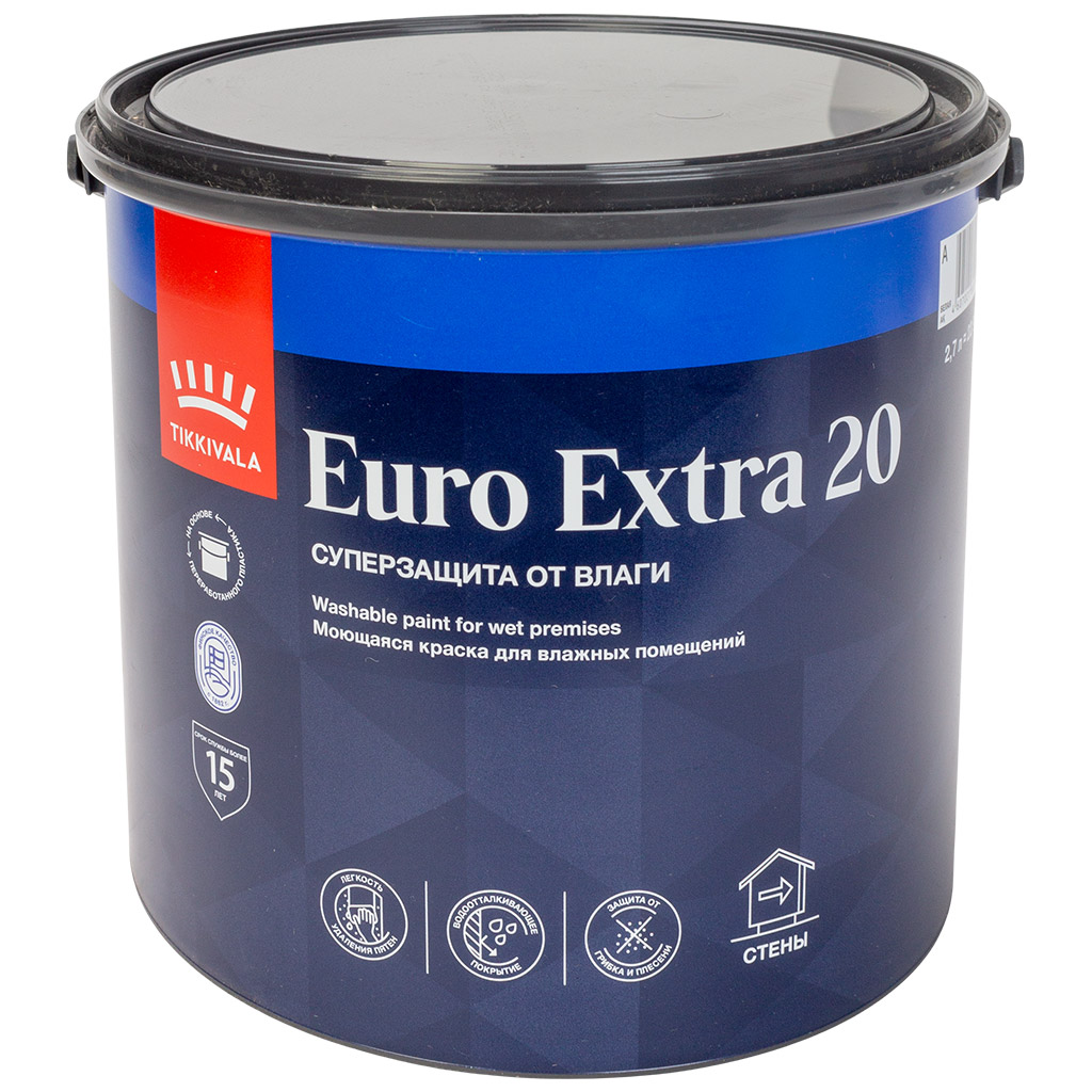 Краска водно-дисперсионная Tikkurila Euro Extra-20, для влажных помещений, моющаяся, полуматовая, база А, 2.7л.