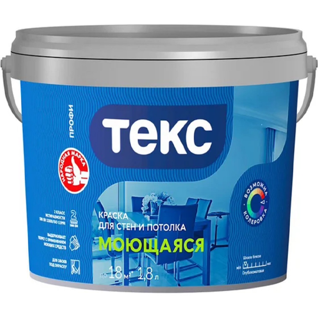 Краска водно-дисперсионная Текс Профи, для стен и потолка, моющая, база A, матовая, белая, 1.8л.