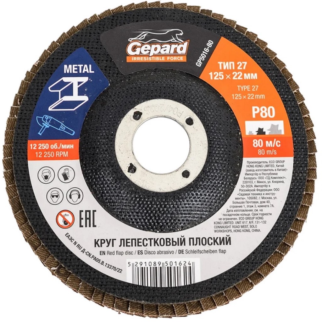 Круг шлифовальный лепестковый Gepard, 125х22.2мм, Р80, плоский