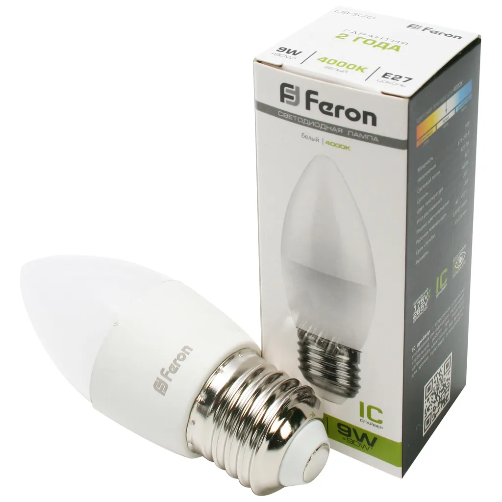 Лампа светодиодная Feron, свеча, 9Вт, Е27, 4000К