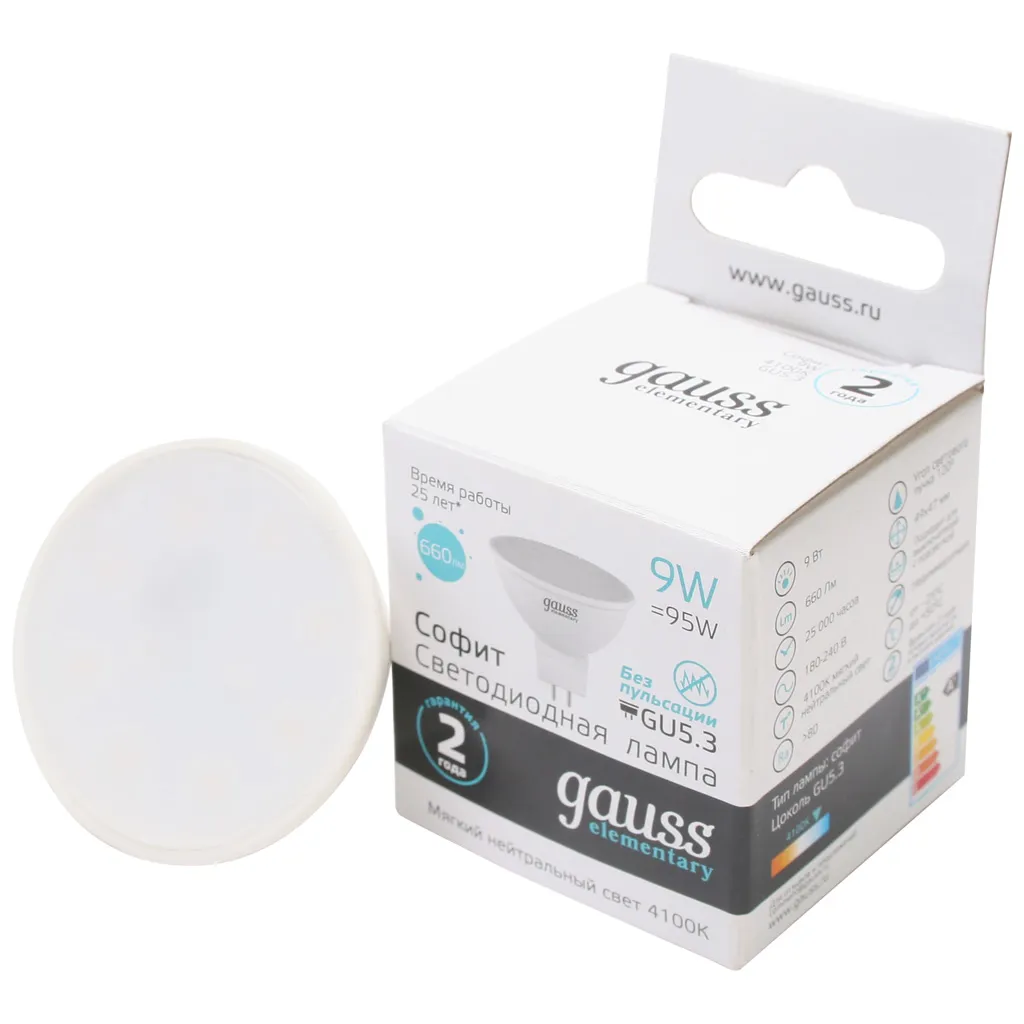 Лампа светодиодная Gauss Elementary, софит, 9Вт, GU5.3 4100К