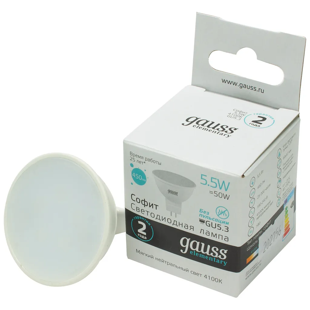 Лампа светодиодная Gauss Elementary, софит, 5.5Вт GU5.3 4100K