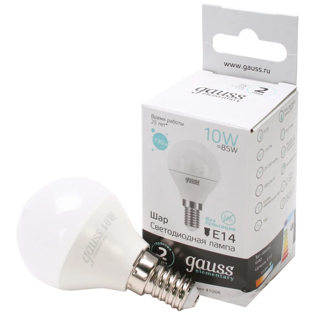 Лампа светодиодная Gauss Elementary, шар, 10Вт, Е14 4100К