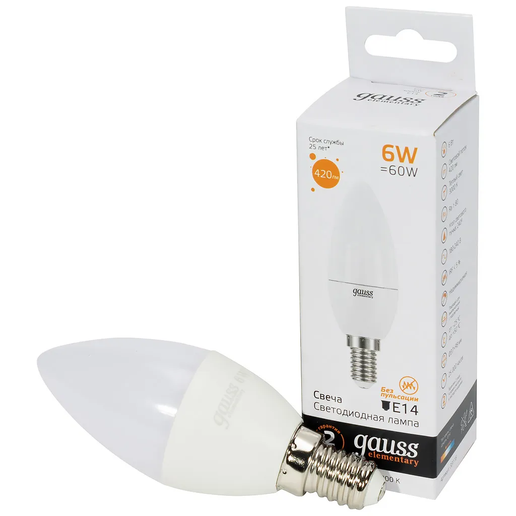 Лампа светодиодная Gauss Elementary, свеча, 6Вт, Е14 3000К