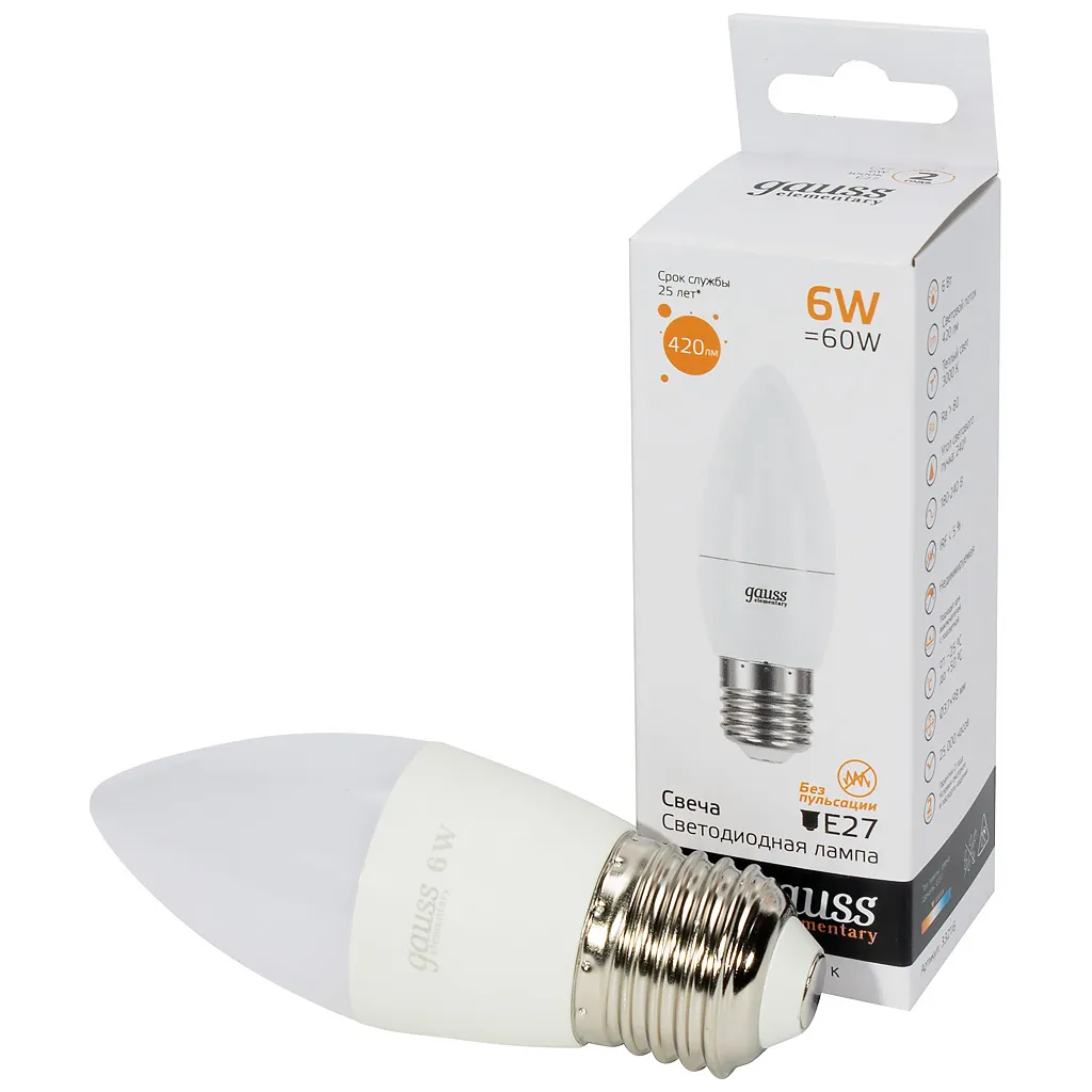 Лампа светодиодная Gauss Elementary, свеча, 6Вт, Е27 3000К