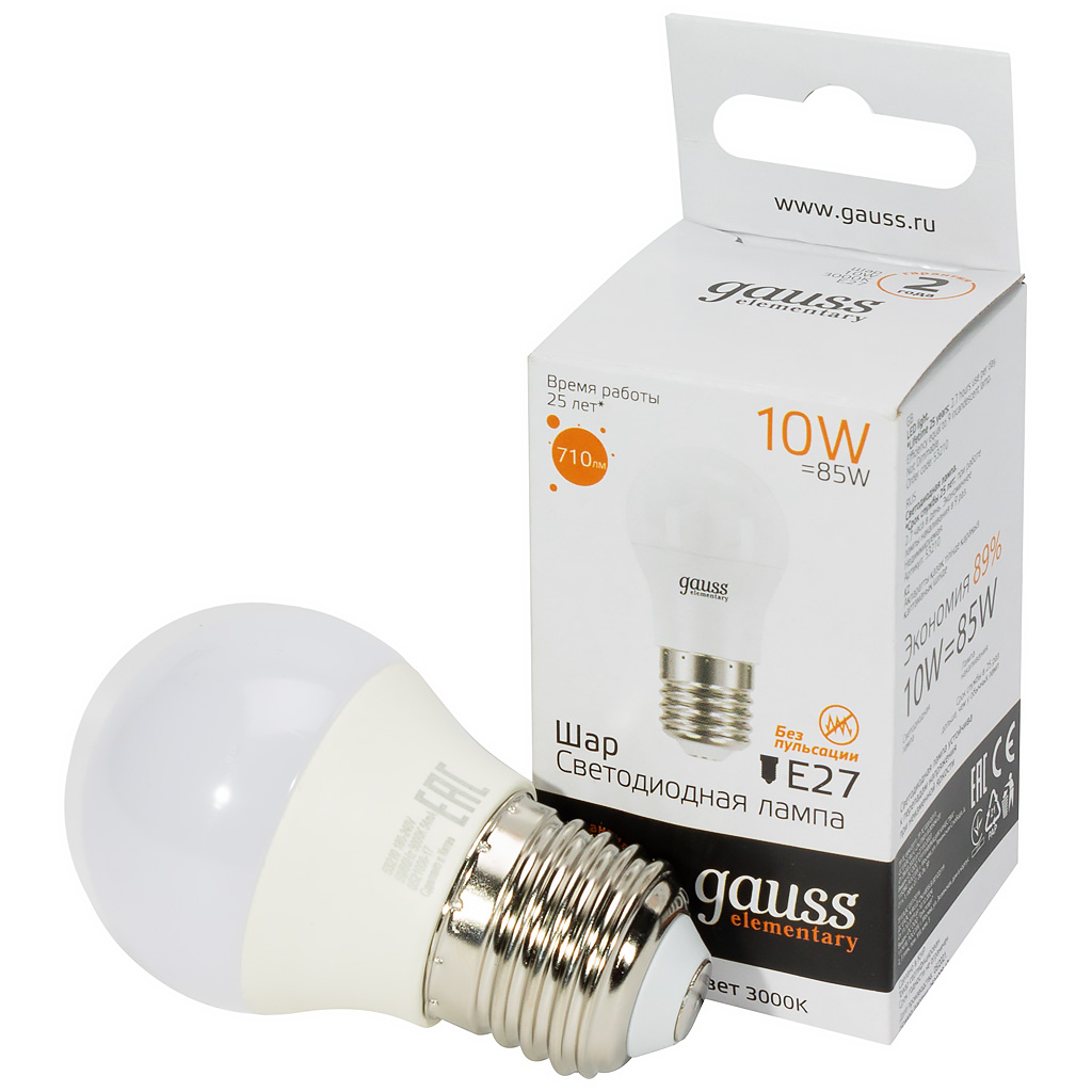 Лампа светодиодная Gauss Elementary, шар, 10Вт, Е27 3000К