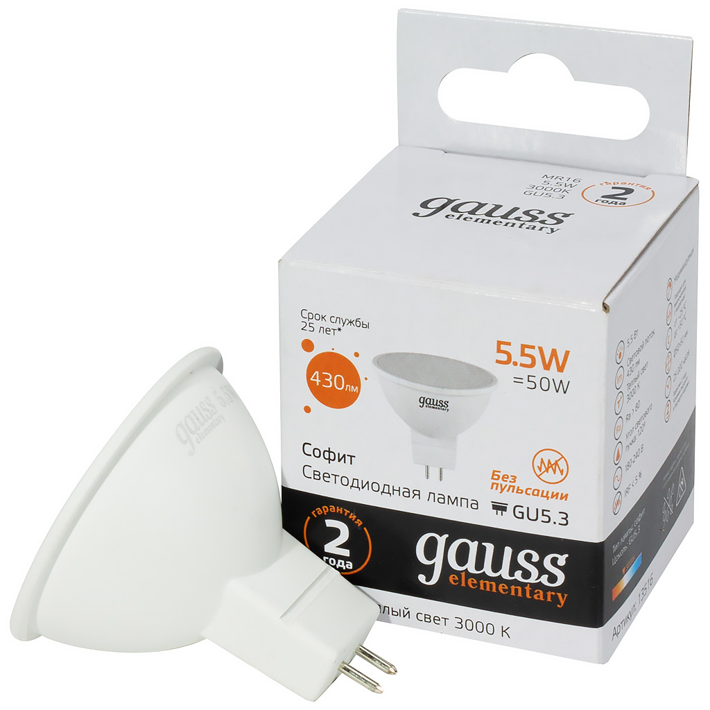 Лампа светодиодная Gauss Elementary, софит, 5.5Вт GU5.3 3000K