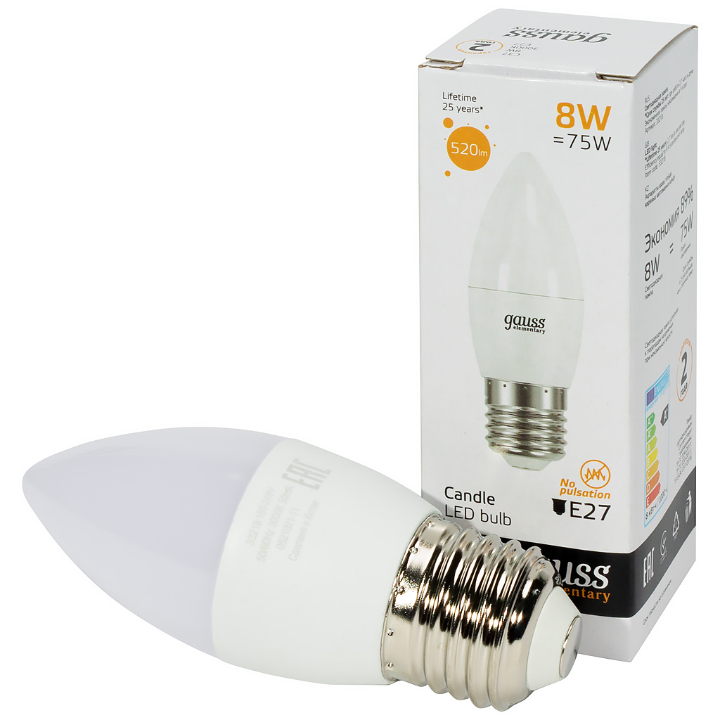 Лампа светодиодная Gauss Elementary, свеча, 8Вт, E27 3000K
