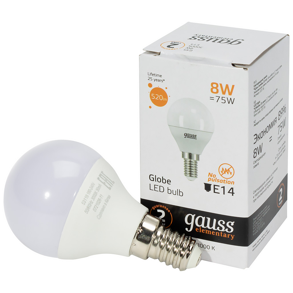 Лампа светодиодная Gauss Elementary, шар, 8Вт, E14 3000K