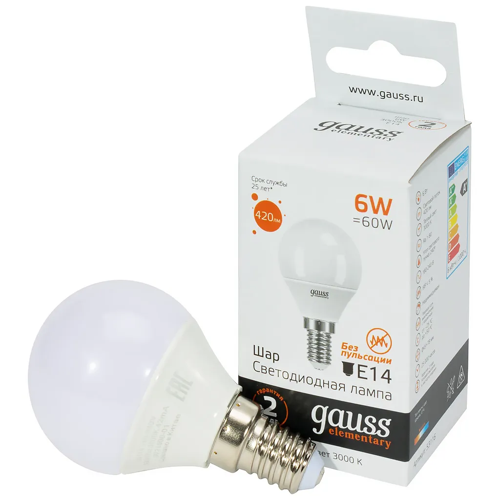 Лампа светодиодная Gauss Elementary, шар, 6Вт, E14 3000K