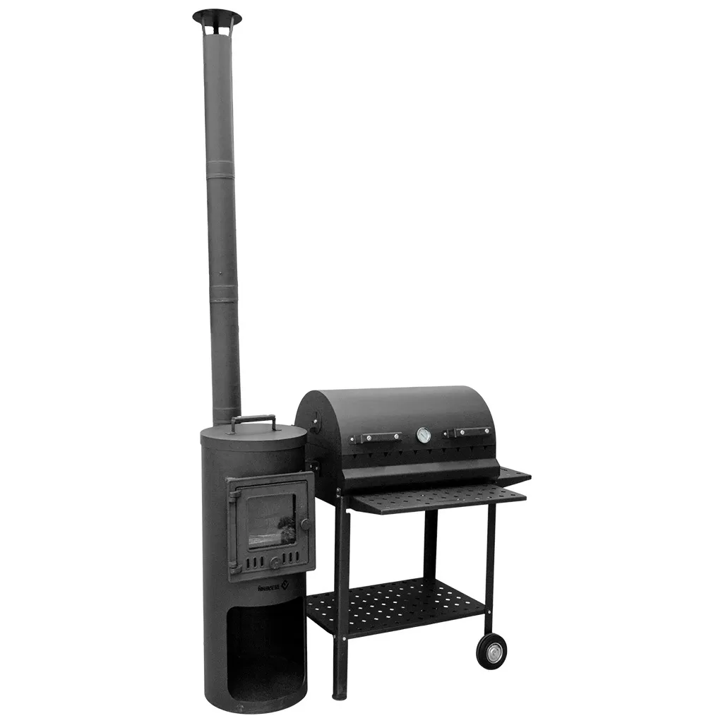 Мангал с учагом Везувий "От Шефа" предназначен для приготовления пищи на открытом воздухе. Мангал рассчитан на 10 посадочных мест под шампуры. Мангал изготовлен из прочной котловой стали (09Г2С) стали, которая обладает устойчивостью к коррозии. Профилированные стенки мангала уменьшают вероятность деформации при нагреве во время работы. Устройство оснащено двумя боковыми столиками и крышкой, которые имеют толщину стали 1 мм. Стальная крышка превращает мангал в полноценный гриль, с возможностью контроля потоков воздуха и готовки под закрытой крышкой. На крышке имеется датчик температуры и клапаны, которые необходимы для регулировки подачи воздуха. Печь под казан Везувий "От Шефа" отличается удобной высотой для работы с казаном, устойчивой конструкцией. Печь изготовлена из термостойкой фирменной качественной стали 09Г2С, а дверка с жаропрочным стеклом выполнена из чугуна. На поверхность печи нанесено жаропрочное коррозионностойкое покрытие, которое выдерживает высокие температуры горения и служит защитой от неблагоприятных окружающих воздействий. Для максимально удобного использования данная печь оснащена зольным ящиком и колосником.
