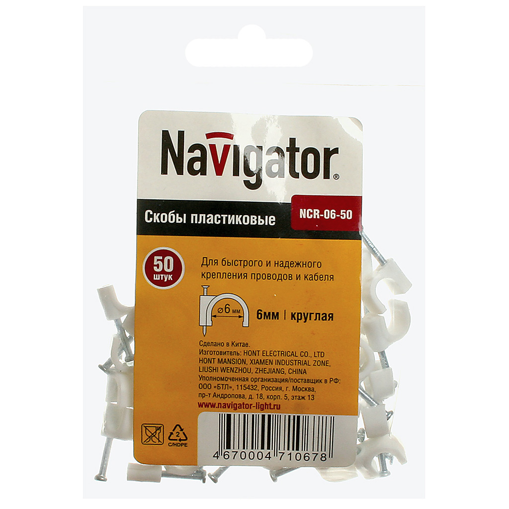Скоба крепления с гвоздиком Navigator, D6мм, круглая, 50шт/уп.