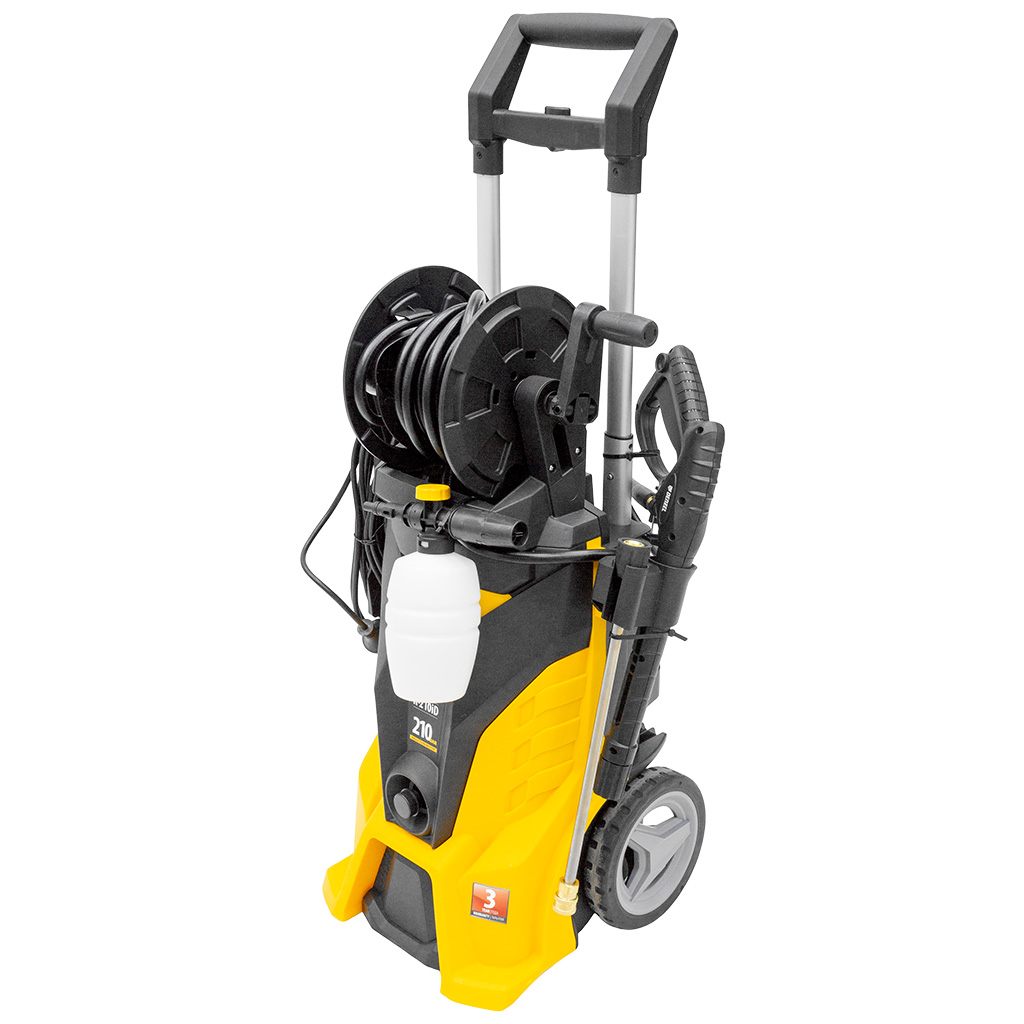 Эффективно справляться с серьезными загрязнениями позволяют мощный мотор 2600 Вт и помпа с производительностью 8 л/мин и максимальным давлением 210 бар. Отсутствие водопровода поблизости не станет проблемой. Мойка с насосом может производить забор воды из любых емкостей благодаря функции самовсасывания, при этом теряя не более 5% давления. Алюминиевая помпа со стальными плунжерами отличается высокой точностью подгонки деталей, что обеспечивает надежность и стабильное давление на выходе. Автоматическое отключение при риске перегрева исключает поломку двигателя. Имеет быстросъемные форсунки позволяют подобрать оптимальный режим, а насадка-удлинитель — мыть рельефные поверхности, быстросъёмный коннектор пистолета позволяет подключить шланг одним движением. металлические штуцеры выдерживают даже сильные рывки шланга, блокировка рычага пистолета позволяет включать автомойку только при полной готовности к работе.