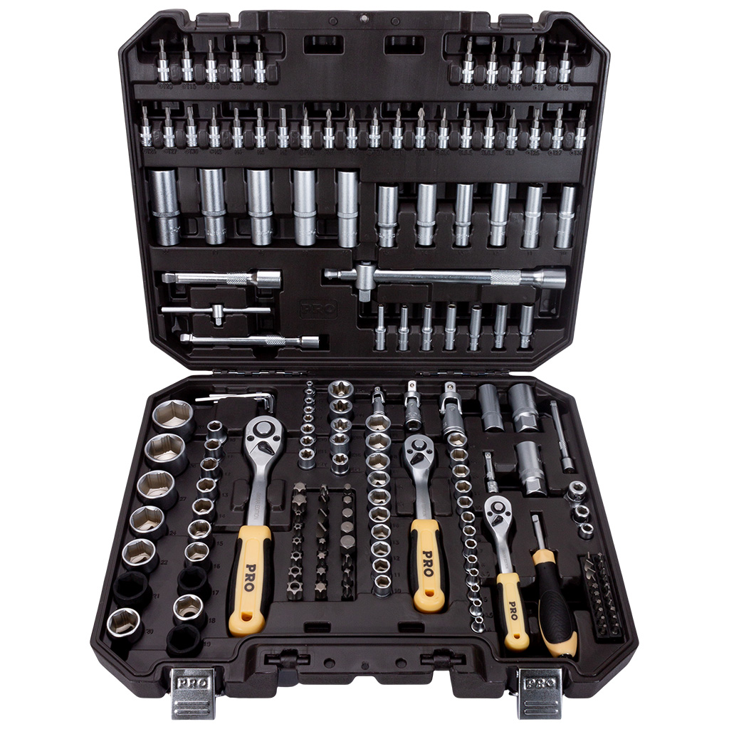 Набор станет надёжным помощником при замене масла, ремонте подвески, обслуживании тормозной системы или сборке мебели. В нём есть всё: набор головок 1/4", 3/8" и 1/2", включая глубокие, ударные и свечные торцевые головки, а также головки с профилями E (внешний TORX). Набор бит охватывает все распространённые типы крепежа: TORX, TAMPER TORX, HEX, SL, PH, PZ, а также специализированные профили S. Набор отверток для автомобиля реализован через воротки и держатели с возможностью быстрой замены насадок. Дополняют комплект трещотки всех трёх размеров, плавающие удлинители, карданные шарниры и набор шестигранных ключей.