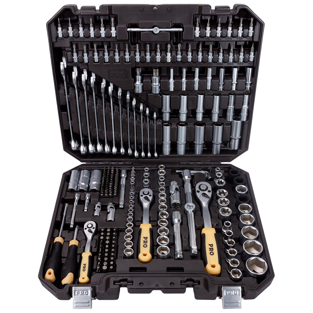В составе — полный набор головок 1/4", 3/8" и 1/2", включая ударные торцевые головки 1/2" (17, 19, 21 мм), глубокие головки, свечные насадки, а также расширенный ассортимент бит TORX, HEX, TAMPER, PH, PZ и других профилей. Набор отверток для автомобиля представлен в виде держателей и воротков с возможностью установки сменных насадок. Также в комплекте — набор ключей комбинированных (8–19 мм) и набор шестигранных ключей Г-образной формы.