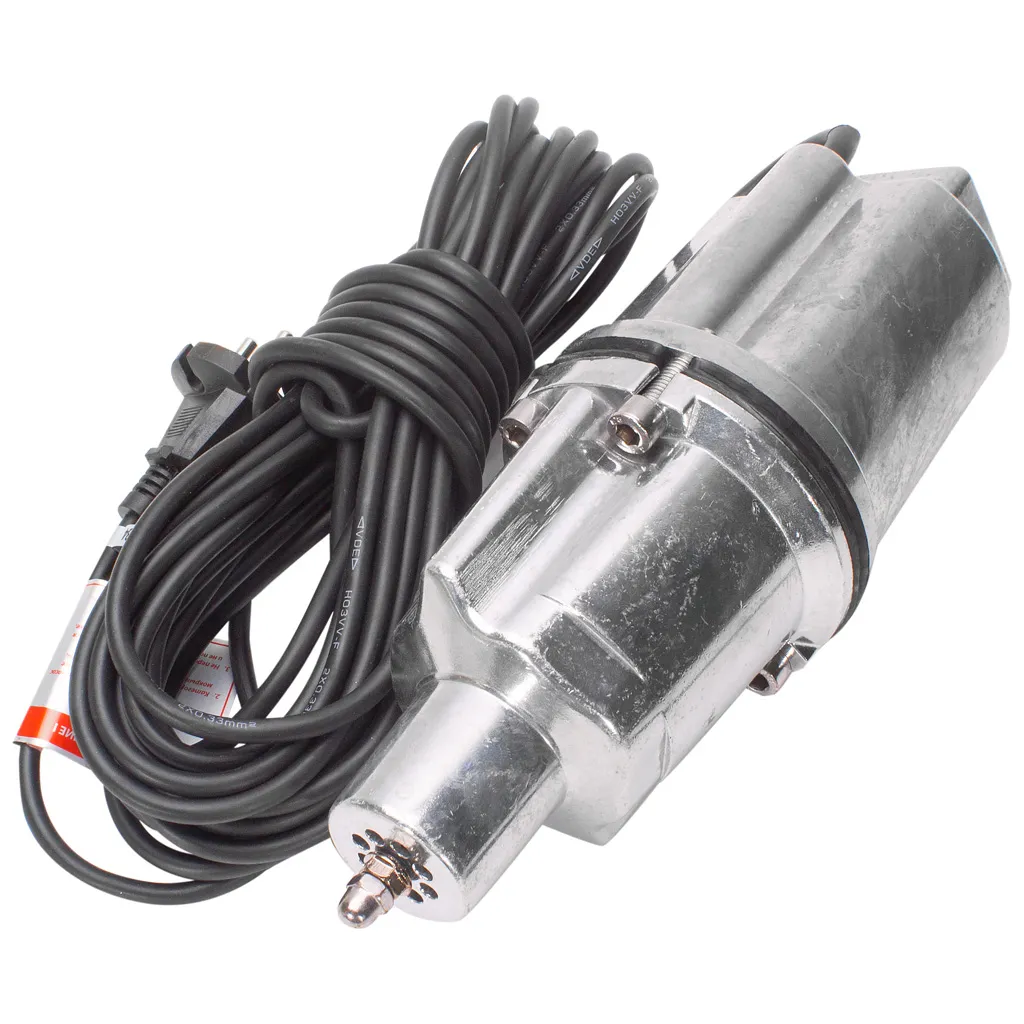 Погружной вибрационный насос, предназначен для откачивания пресной воды из колодцев, водоемов, бассейнов и различных ёмкостей, с дальнейшим использованием воды для хозяйственных нужд и скважин диаметром более 10 см. Для удобства погружения/поднятия на корпусе насоса предусмотрено ушко для троса. При работе вибрационный насос не должен соприкасаться со стенками и дном. Работает от сети 220 В при помощи шнура длиной 10 м. Вибрационный погружной насос с производительностью от 18 до 7 литров в минуту подает воду на 60 метров. Глубина погружения насоса вибрационного для колодца – не более 3 метров.