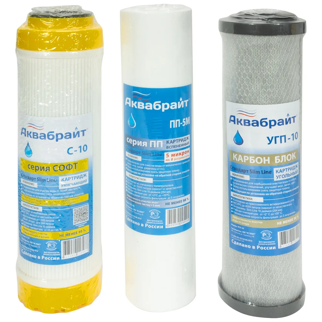 Комплект из 3-х картриджей Аквабрайт, серии К-2 Умягчение, устанавливается в магистральные фильтры Аквабрайт АБФ-ТРИА и другие системы стандарта Slim Line-10 и предназначен для доочистки питьевой воды для личных целей.
