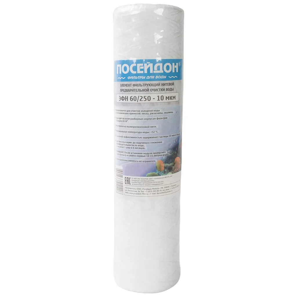 Картридж Посейдон ЭФН 60/250-10мкм, изготовлен из полипропиленовой нити, намотанной на жёсткий полиэтиленовый каркас. Намотка обеспечивает большую грязеёмкость по сравнению с картриджами из вспененного полипропилена. Картридж используется в магистральных фильтрах и предфильтрах многоступенчатых систем очистки воды. Предназначен для очистки воды от механических примесей: песка, ржавчины, ила и т.д. Защищает стиральные, посудомоечные машины, водонагреватели от неблагоприятного действия механических примесей.