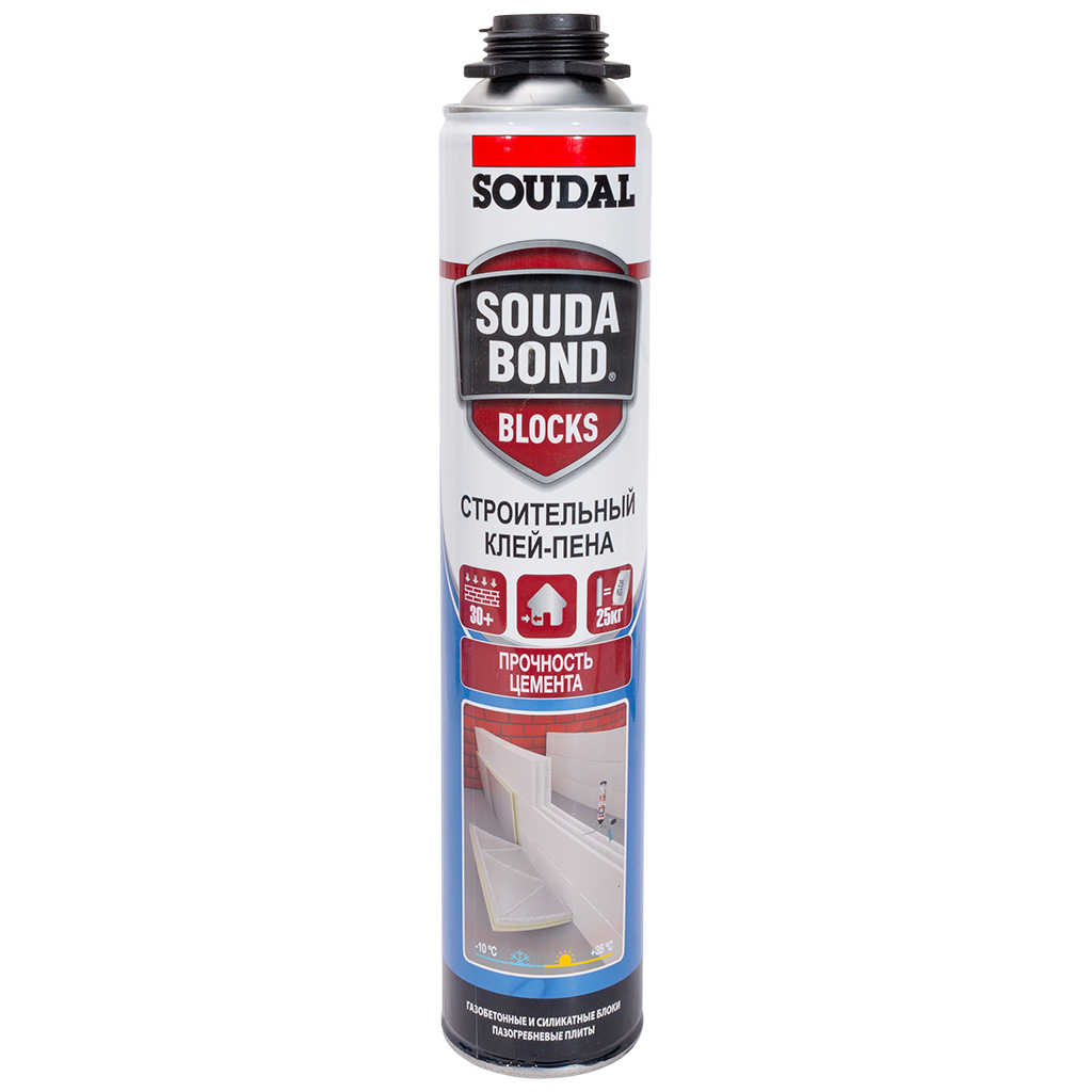 Клей-пена полиуретановая Soudabond, применяется для монтаж гипсокартона, крепления изоляционных материалов внутри и снаружи помещений, устройство ненесущих стен и перегородок из пазогребневых плит, силикатных, газобетонных и других видов блоков