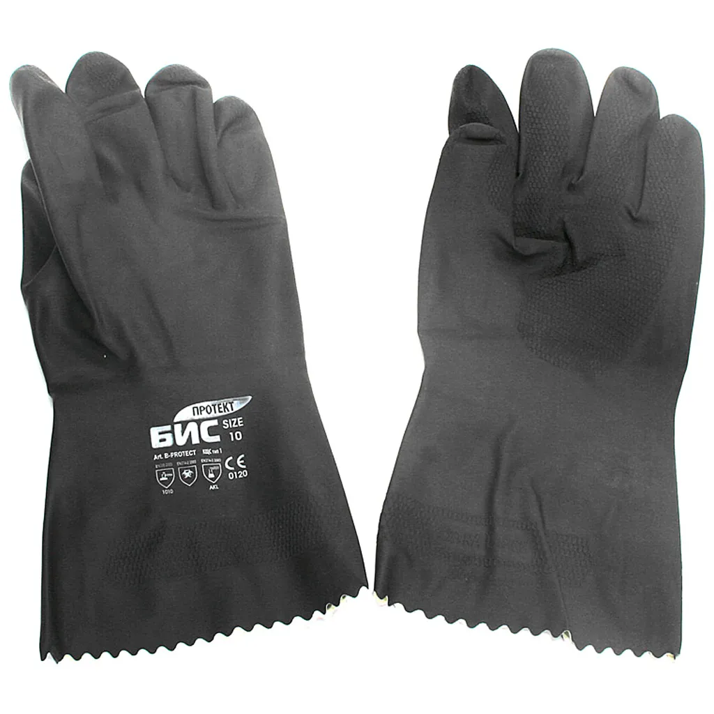 Перчатки Бис, обеспечивают превосходную защиту рук от механических воздействий при проведении общехозяйственных работ, а также от растворов кислот (60 %) и щелочей (50 %).