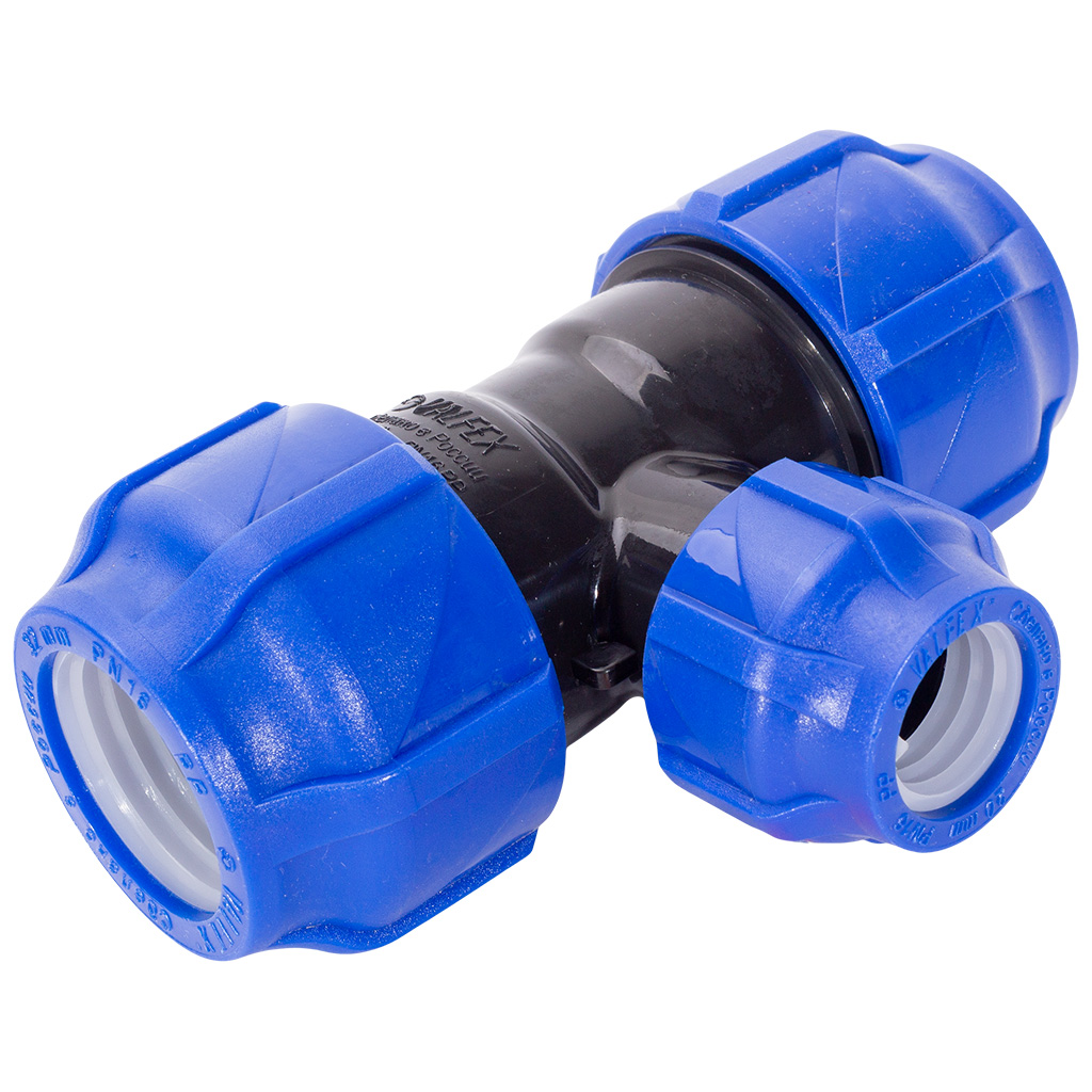 Тройник компрессионный, применяется для быстрого и надежного монтажа отвода трубопровода в системах труб из полиэтилена, применяемых для питьевого и технического водоснабжения, в системах орошения, канализации, для перекачки химических растворов к которым стоек полиэтилен.