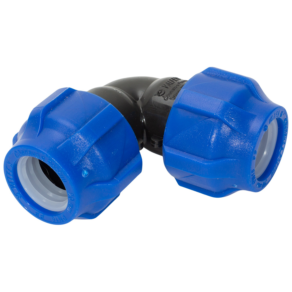 Компрессионный отвод - обжимной фитинг системы холодного водоснабжения, предназначенный для плавного изменения направления трубопровода под углом 90°. Несмотря на то, что материал трубы ПНД (полиэтилен) довольно гибкий, в нагруженных инженерных сетях нельзя допускать резких углов.