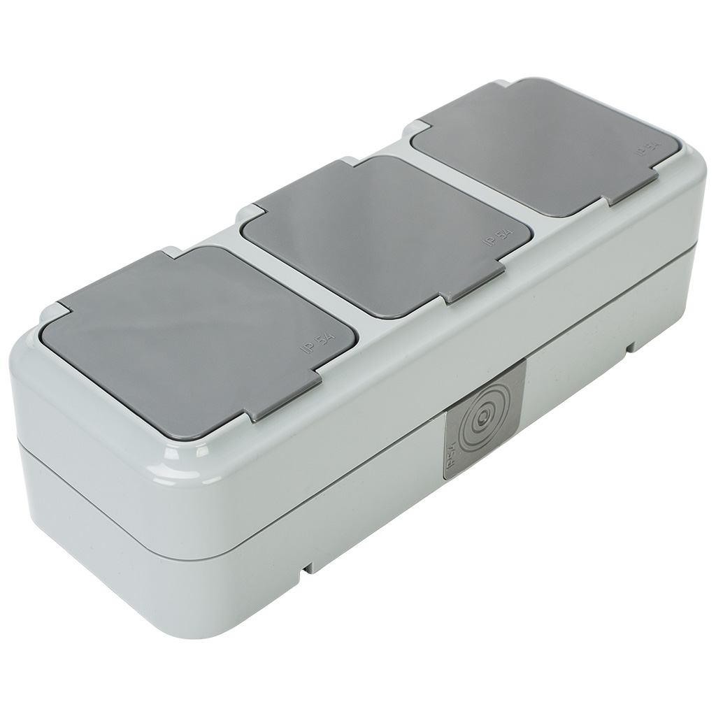 Блок открытой проводки Bylectrica Пралеска Аква, розетка 3-местная, с заземлением, с крышкой, IP54, серый