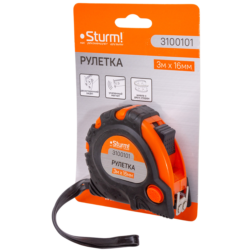 Рулетка Sturm!, 3м х16мм, 3 кнопки стопа, двухсторонняя, магнит на зацепе